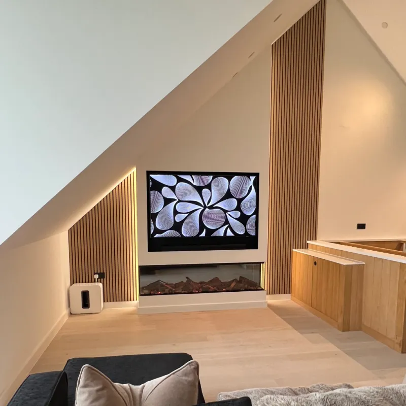 Bespoke designs with integrated fireplaces and soundbars. We are the leading choice for high-end Media Wall installations across Cheshire.